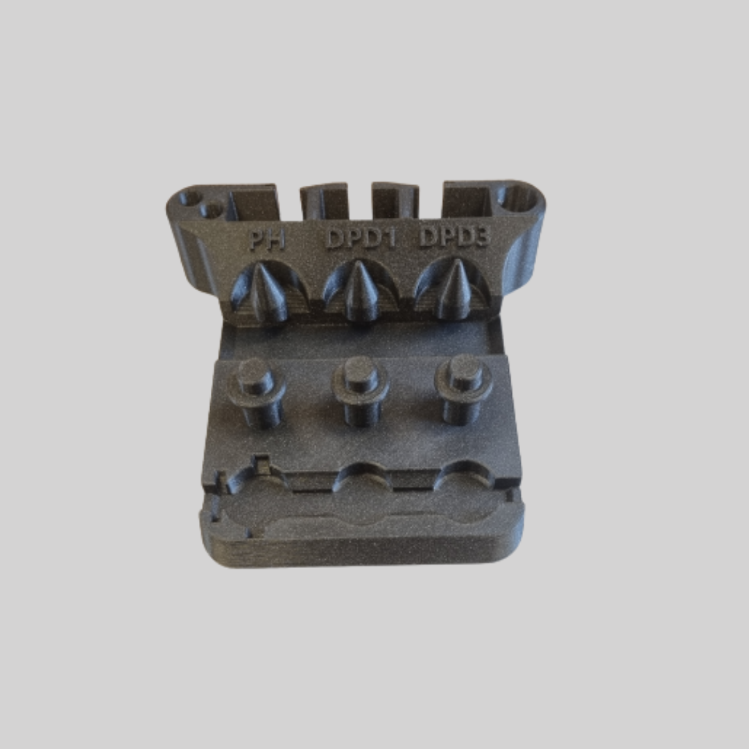 Praktisk holder til Palintest Pooltest udstyr. Med plads til: pH, DPD1 og DPD3 blisterpakker Tørreplads til kuvetter og låg Pladser til rørepinde og pilleudstandser