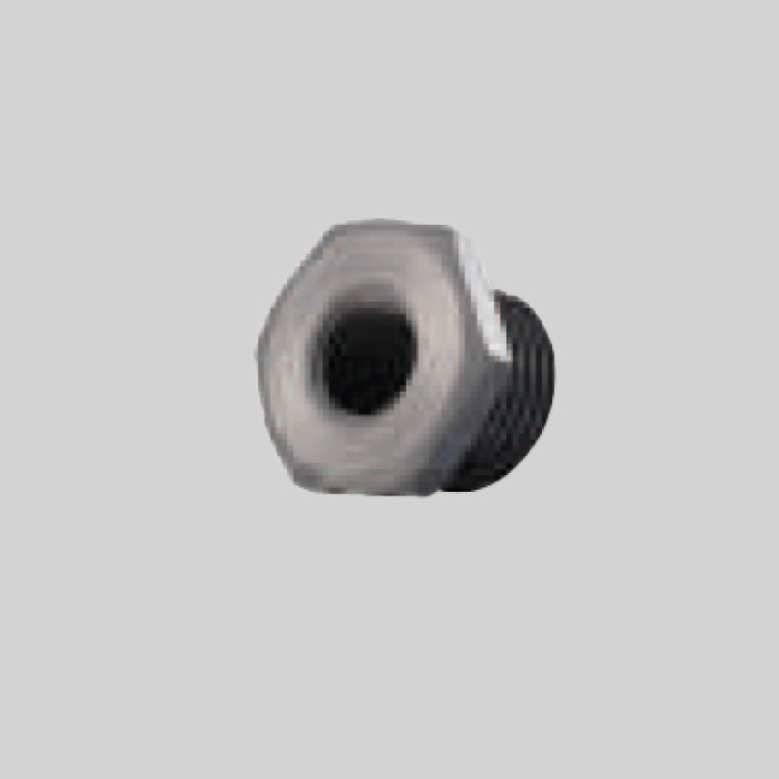 Reduktion i PVC. Fra udvendig 1/2″ gevind til indvendig 1/4″ gevind.