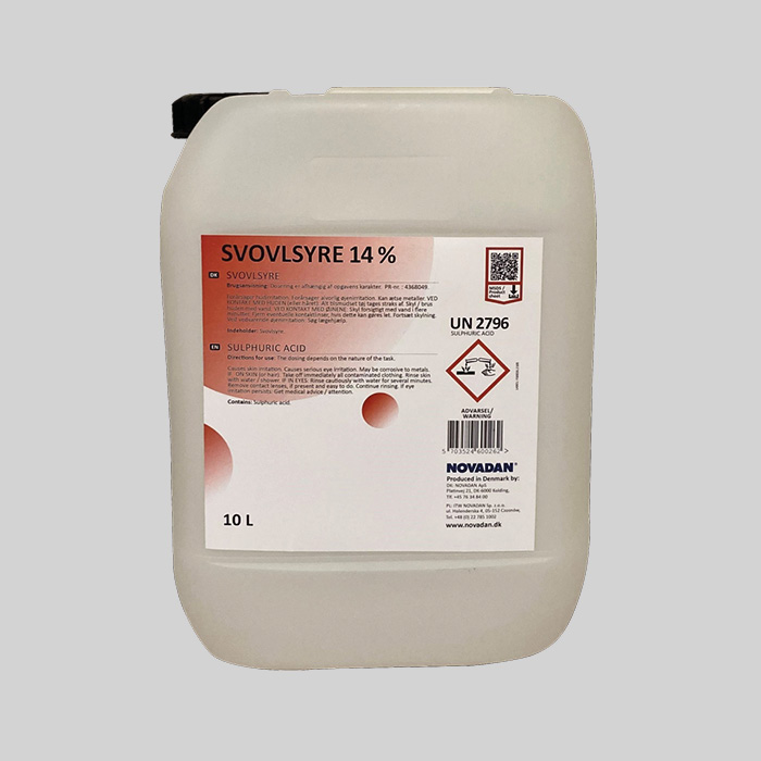 Svovlsyre 14 % anvendes til effektiv pH-neutralisering af vand i tekniske anlæg og vandbehandlingssystemer. Den er mindre aggressiv over for metaller end andre syrer og bidrager til længere levetid på installationer og komponenter.