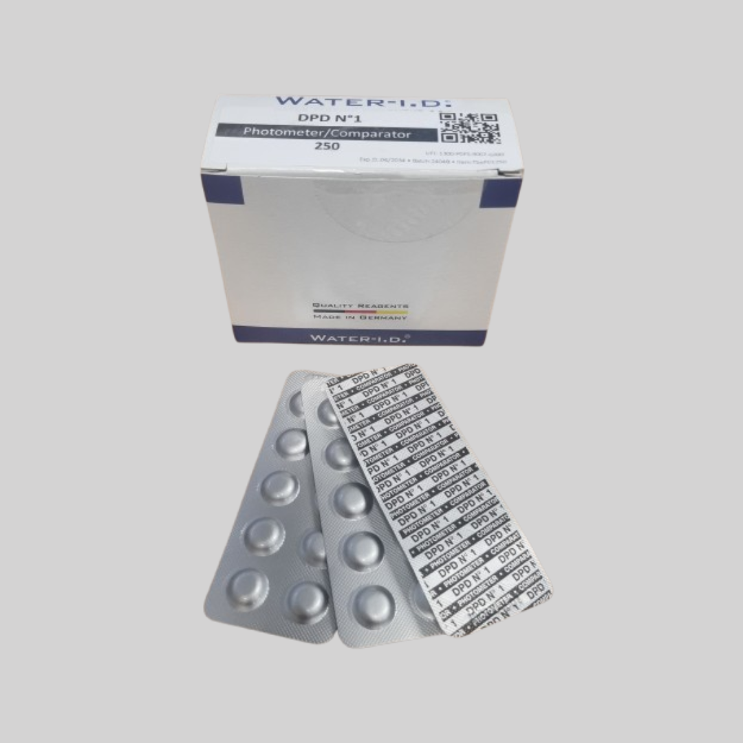 Water-i.d. DPD1 er testtabletter til præcis fotometrisk måling af fri klor (FCl) i vand. Produktet anvendes sammen med fotometer og måler klorindhold i området 0–8 mg/l. Leveres i pakke med 250 tests – ideel til professionel brug i svømmehaller, spaområder og tekniske anlæg med behov for løbende vandkvalitetskontrol.